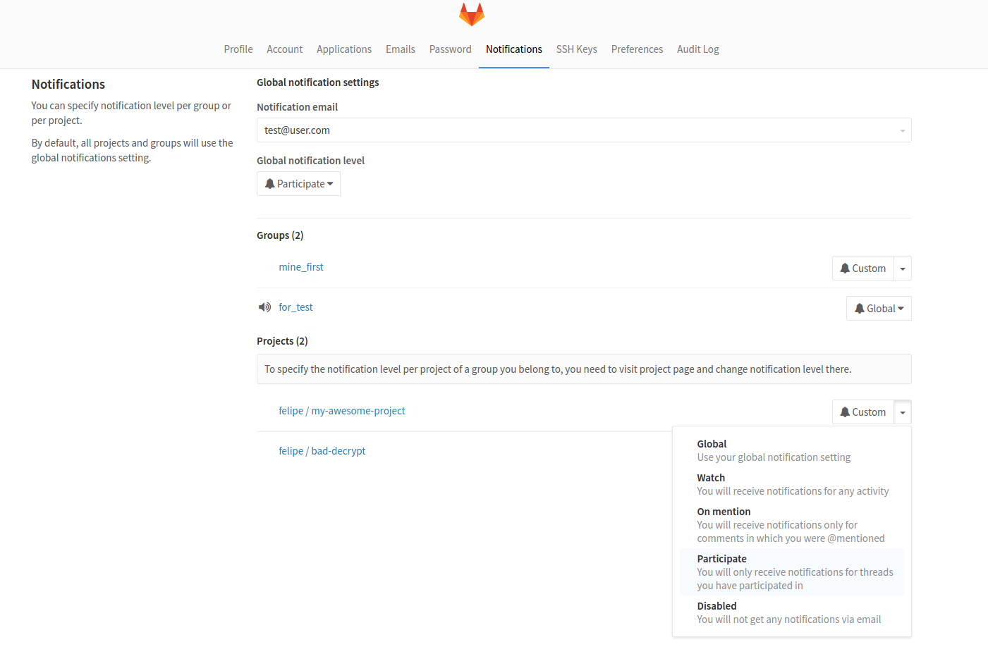 Group Settings are taking precedence over Global Settings but are on a level below Project Settings. This means that you can set a different level of notifications per group while still being able to have a finer level setting per project. Organization like this is suitable for users that belong to different groups but don't have the same need for being notified for every group they are member of. These settings can be configured on group page or user profile notifications dropdown.